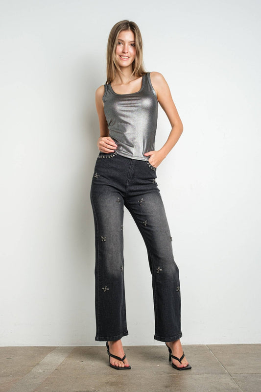 Black Rhinestone Embellished Straight Leg Jeans — Gunmetal Crystal Detail